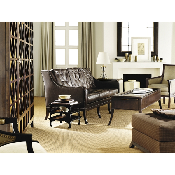 From Mark Cutler Design, “In the living room, a collection of eclectic small tables, including a Chinese stool and a Cambodian drum, was used instead of one large coffee table. The grouping is more visually interesting and flexible; the tables can be separated and used in different conversation areas.”